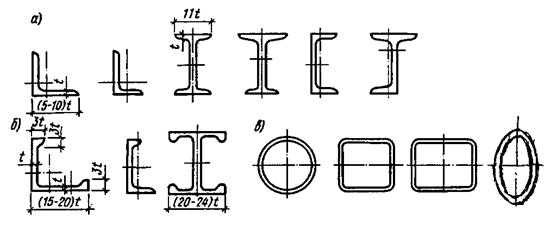 Первичным элементом стальных конструкций является прокатная сталь, которая выплавляется на металлургических заводах. Прокатная сталь, применяемая в стальных конструкциях, делится на две группы: сталь прокатная листовая (рис.3.1,а) - тонколистовая, толстолистовая, широкополосная, универсальная и просечно-вытяжная; сталь профильная (рис.3.1,б) – уголки, швеллеры, двутавры, тавры, трубы и т. п. Наличие сортаментов готовых прокатных профилей на заводах обеспечивает индустриальное изготовление конструкций.
