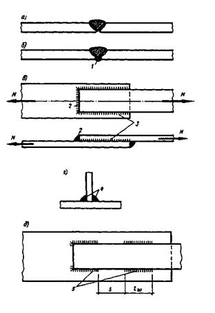 а – стыковой шов в однопроходном стыковом соединении; б –стыковой шов с подваркой корня в однопролетном стыковом соединении; в – фланговый и лобовой швы в нахлесточном соединении; г – угловые швы в тавровом соединении; д – прерывистые (шпоночные) швы в нахлесточном соединении; 1 – подварка корня шва; 2 – лобовой шов; 3 – фланговый шов; 4- угловые швы; 5 - прерывистые или шпоночные швы