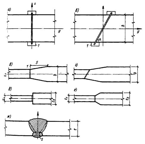 д, е – при разной толщине соединяемых элементов; ж – однослойный с подваркой корня; 1 – технологические планки; 2 – подварочный шов
