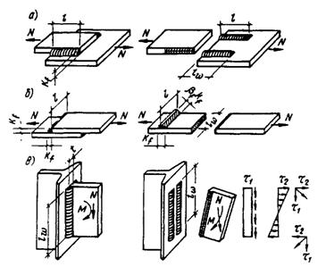 а - на разрушение соединений с фланговыми швами; б – с лобовыми швами; в – работающих на изгиб