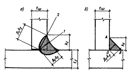 - отношение минимальных размеров в сечении шва к катету шва (см. рис.4.7). При ручной сварке, когда глубина проплавления невелика и заштрихованную площадь на рис.4.7,б можно считать равносторонним прямоугольником, а