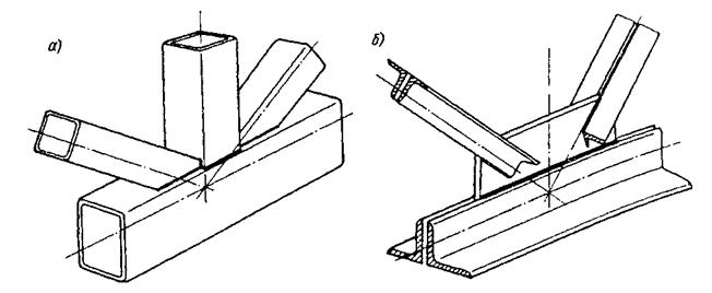 Прямоугольные гнуто замкнутые сечения (рис.9.10,б) обладают почти теми же преимуществами, что и трубчатые, позволяют упростить узлы сопряжения элементов и нашли широкое применение. Однако, фермы из гнуто замкнутых профилей с бесфасоночными узлами требуют высокой точности изготовления.