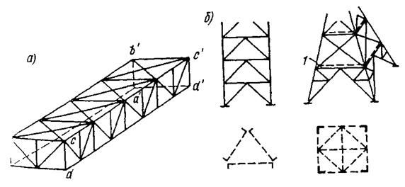 пространственный брус в поперечном сечении замкнут, он обладает большой жесткостью при кручении и изгибе в поперечном направлении, поэтому потеря его общей устойчивости невозможна. Конструкции мостов, кранов, башен, мачт и т. п. представляют собой также пространственные брусья, состоящие из ферм (рис.9.8,б).
