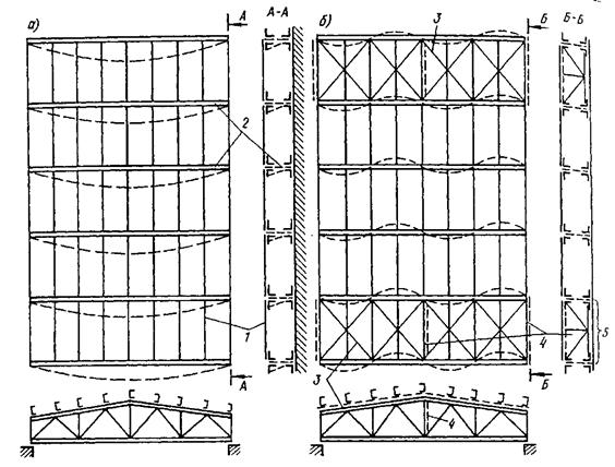 1 – прогоны; 2 – фермы; 3 – горизонтальные связи; 4 – вертикальные связи;