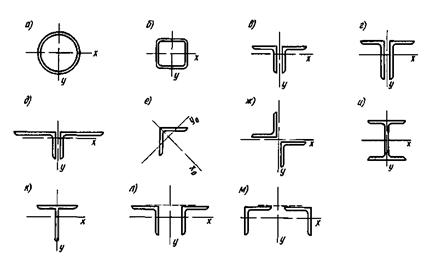 Наиболее распространенные типы сечений элементов легких ферм, показаны на рис.9.10.