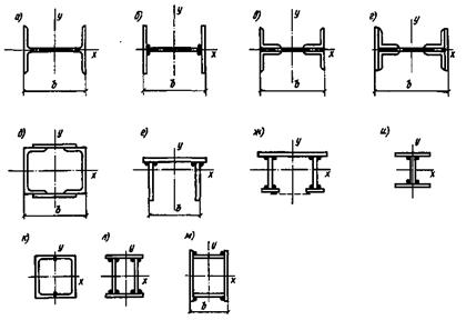 Швеллерное сечение состоит из двух швеллеров, поставленных полками внутрь (рис.9.11,д); используются как прокатные, так и составные швеллеры. Такое сечение целесообразно для сжатых элементов, особенно при большой их длине. Недостатком швеллерного сечения является наличие двух ветвей, которые приходится соединять планками или решетками (аналогично центрально сжатым колоннам).