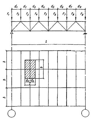 на ферму прикладывается обычно в узлах фермы, к которым прикрепляются элементы поперечной конструкции (прогоны кровли или подвесные потолки), передающие нагрузку на ферму. Если нагрузка приложена непосредственно в панели, то в основной расчетной схеме она также распределяется между ближайшими узлами, но дополнительно учитывается местный изгиб пояса от расположенной на нем нагрузки. Пояс фермы при этом рассматривается как неразрезная балка с опорами в узлах.