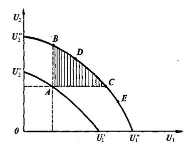 В то же время улучшения по критерию Калдора—Хикса возможны в более широкой области. Так, следует предположить, что при переходе от А к Е первый индивид смог бы компенсировать второму понесенные потери, поскольку кривая ![]()