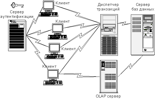 Сервер аутентификации проверяет возможность доступа в ИС, а OLAP-сервер выполняет сложный анализ данных.