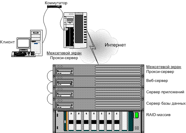 Клиент — веб-браузер — взаимодействует с веб-сервером по протоколу HTTP через два межсетевых экрана (брандмауэра, файервола) и прокси-сервер. На веб-сервере выполняется приложение PHP (ASP, JSP, Perl или какое-либо другое), которое обращается к серверу баз данных.