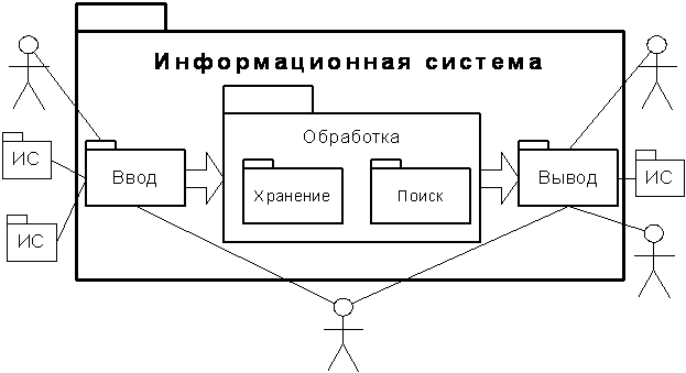 - ввод информации (сбор информации, прием информации из других ИС) обработка информации (в частности, хранение и поиск информации) вывод информации (демонстрация ее человеку, передача в другие ИС).