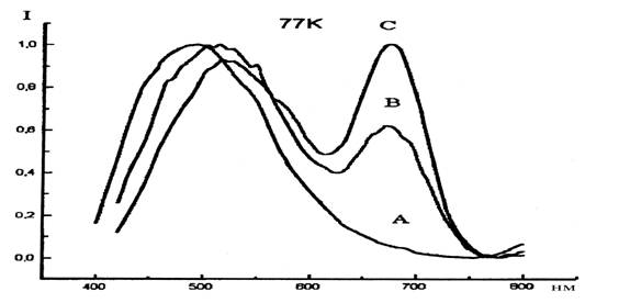 Сравнительный анализ спектров люминесценции (Рис. 1) кварца до имплантации (A), после имплантации ионов железа (B) и после отжига (C) показал наличие в желтом кварце изоморфных ионов трехвалентного железа, связанных в комплексы (FeO4)5-.