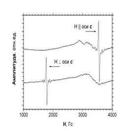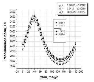 Рис. 2. ЭПР спектры голубого образца корунда, окрашенного путем имплантации Со+ ионов с дозой 2,0 ´ 1017 ион/см2 с последующим отжигом в атмосфере воздуха при 970о С в течение часа | Рис. 3. Ориентационная зависимость величины резонансного поля для центральной (ЦК) и сверхтонких (СВТ) компонент ЭПР спектра голубого корунда, окрашенного путем имплантации ионов кобальта с дозой 2,0 ´ 1017 ион/см2 с последующим термическим отжигом |