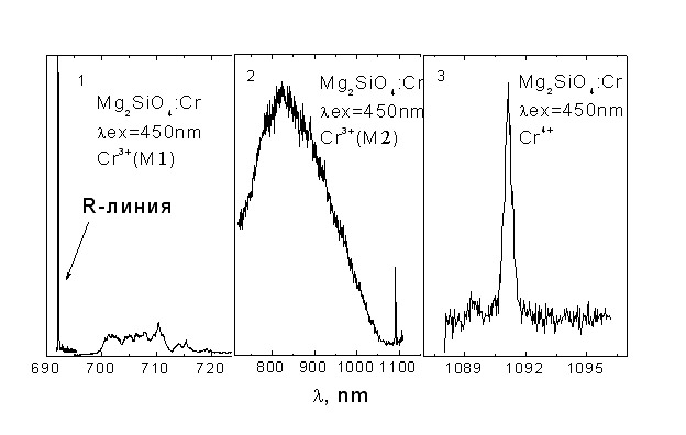 Рис. 4. Спектры люминесценции форстерита Mg2[SiO4], имплантированного ионами хрома, записанные при температуре 4,2 K: (1) - Cr3+ в позиции М1, (2) - Cr3+ в позиции М2, (3) - Cr4+ в тетраэдрической позиции