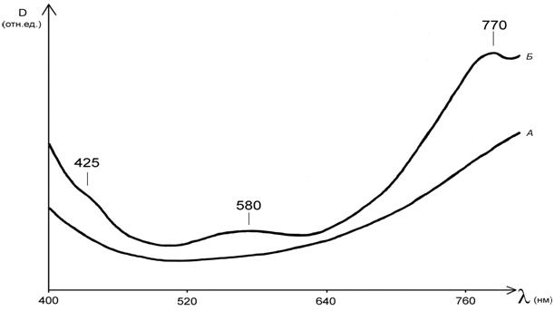 Рис. 5. Оптические спектры поглощения берилла: А – исходный, бесцветный образец до имплантации и отжига, Б – зеленый образец после имплантации ионами ванадия и отжига
