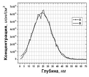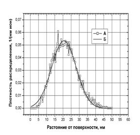 Рис. 6. Профили распределения ионов кобальта c энергией 40 кэВ в образце синтетич. корунда: (А)–профиль, рассчитанный с использованием алгоритма SRIM-2000; (Б)-соответствующий профилю модельный Гауссиан с параметрами Rp=21 нм и DRp=7,5 нм | Рис. 7. Профили распределения ионов марганца c энергией 40 кэВ в образце синтетич. рутила: (А)–профиль, рассчитанный с помощью пакета SRIM-2003; (В)-соответствующий профилю модельный Гауссиан с параметрами Rp=23,5 нм и DRp=9,7 нм |