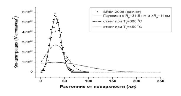 Несомненным достоинством программных средств SRIM является возможность дискретного компьютерного моделирования по времени, температурному воздействию и т. п. На рис. 8. показано изменение глубины распределения ионов ванадия, имплантированных вдоль кристаллографической оси С структуры природного бесцветного берилла (гл. 3 диссертации), в зависимости от температуры отжига образцов.