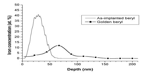 Изучение золотисто-желтых бериллов, имплантированных ионами железа методами адсорбционной оптической спектроскопии позволило выявить изоморфное вхождение имплантированных ионов железа как в октаэдрические, так и в тетраэдрические позиции структуры минерала. Запись и интерпретация Мессбауэровских спектров исследуемых бериллов после имплантации и после отжига позволили подтвердить данный вывод.