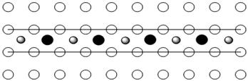 Процесс собственно ионной имплантации (А) заканчивается этапом принудительного внедрения атомов (Б) с частичной аморфизацией и дезинтеграцией приповерхностных зон облучаемой матрицы. Некогерентное состояние имплантанта к структуре мишени отражено интерстициальным расположением атомов первого по отношению к плоским сеткам облученной матрицы. Этот период представляет собой неустойчивую фазу самостоятельного «металлического» состояния имплантированной примеси в структуре исходной матрицы.