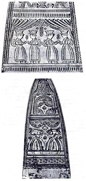На рис 1 представлены фрагменты старинных русских прялок, украшенных геометрической резьбой.