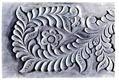 Плоскорельефная резьба с выбранным фоном выполняется так же, как и обычная заоваленная. формы орнамента остаются плоскими, а края форм круто заоваливаются. Фон в этой резьбе выбирают на небольшую глубину. Орнамент как бы лежит на ровной плоскости. Фон иногда чеканят (рис. 4). Игра светотени здесь несколько богаче, чем в заоваленной резьбе, но также небольшая. Поэтому плоско рельефную резьбу выполняют в основном на мелких предметах и отделывают полированием.
