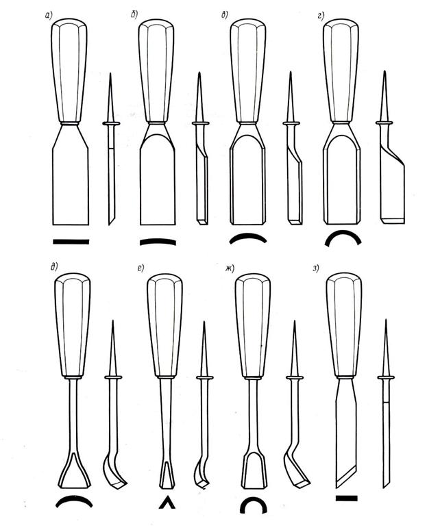 Геометрическая резьба состоит из различных комбинаций нескольких основных элементов, выполняемых ножом-косячком и полукруглыми стамесками.