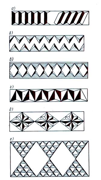 При разметке витейки (рис. 13, а) вначале проводят две параллельные линии, ограничивающие ширину ленты орнамента. Затем проводят среднюю линию. После этого размечают прямоугольники, а в них — треугольники.