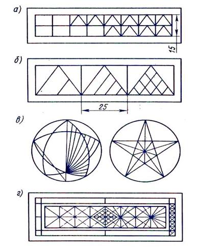 При разметке сложного орнамента (рис. 13, г) сначала вычерчивают рамку для каймы, затем внутренний прямоугольник для основного орнамента. Ленты каймы и основного орнамента делят на прямоугольники, внутри которых проводят диагонали. Полученные треугольники можно делить на более мелкие, проводя вертикальные и горизонтальные линии через точки пересечения диагоналей. В треугольниках можно чертить различные узоры: сияние, сколышки, а в ромбах — чешуйки и т. п.