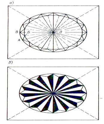 Для получения пятиконечной звезды (рис. 13, в) окружность делят с помощью циркуля на пять частей. Соединяя полученные точки дугой с помощью циркуля, получают левую звезду, соединяя точки прямыми линиями,— правую[5].