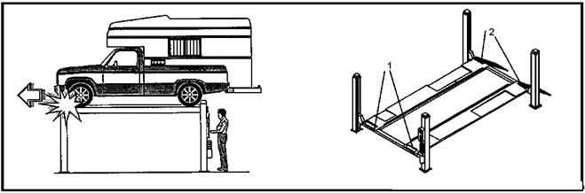 Чтобы защитится от последствий продольных перемещений, на подъемнике в передней его части установлены тормоза (1) , и поворотные заезды (2) в задней части. Эти детали являются неотъемлемой частью платформ и служат, чтобы защитить транспортное средство в течение подъема и опускания, и когда транспортное средство находится в поднятом положении от продольных перемещений, таким образом предотвращая любое потенциально опасное движение.