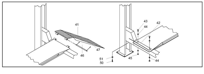 Заезды (41, рис. 56) и тормоза колес (42) можно установить с обеих сторон платформ (7-8), в соответствии с пожеланиями владельца. Вставьте с нужной стороны заезды (41) и закрепите шпилькой (46), а аотом закрепите винтами М10х25 (43), шайбами Æ11х30 (44) и гайками М10 (45) тормоза колес (42) с противоположной стороны. При необходимости затяните регулировочные винты (50 и 51).