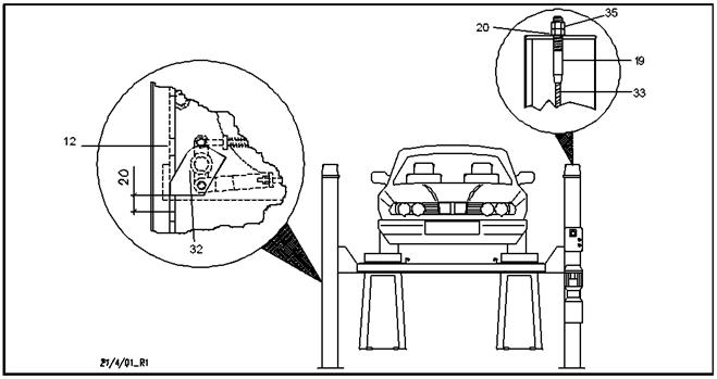 Проверьте, что расстояние от замка безопасности (32) до нижнего края паза линейки безопасности (12) на всех четырех стойках не менее 20 мм; если этот размер будет меньше, это будет препятствовать открытию замков безопасности при опускании платформы.