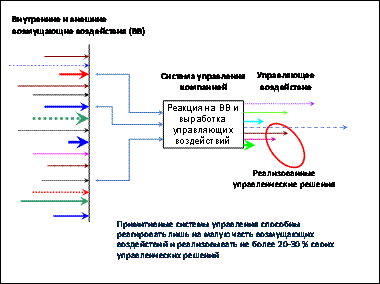 Пример: клиентская организация, занимающаяся поставкой систем безопасности (охранно-пожарные сигнализации, видеонаблюдение и пр.). Численность персонала – 120 человек. При анализе выявляются около 150 значимых внутренних и внешних возмущающих факторов, а система управления компанией реально реагирует только на 40. Ее нетехнологичность просто не позволяет управлять большим.