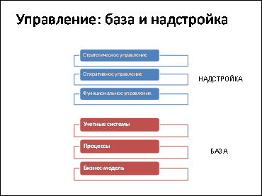 Систему управления компанией можно разделить на базисную часть и надстройку (hard и soft). И как показывает практика, надстройка без базы имеет очень низкий КПД.