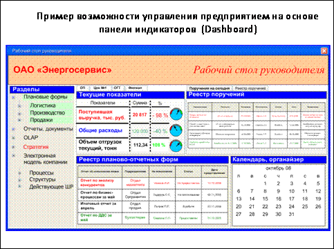· отображение операционной деятельности компании на панели индикаторов рабочего стола руководителя, и т. д.