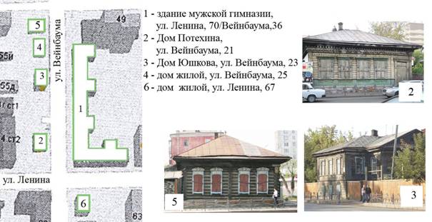 Рядовые здания массовой застройки, формирующие локальные зоны, включающие признанные памятники архитектуры, имеют градостроительную ценность, являясь пространственной средой памятников архитектуры. Масштаб этой среды создает окружение, в целом соответствующее историческим параметрам городского пространства. Несколько деревянных жилых домов по улице Вейнбаума (№ 21, 23, 25), формируют застройку, прилегающую к участку, на котором расположено здание бывшей губернской мужской гимназии (ул. Ленина, 70/ул. Вейнбаума, 38). В комплексе со зданием гимназии жилые дома составляют достойный сохранения исторический пласт городской среды. Из трех вышеперечисленных жилых домов рекомендован к постановке на охрану только дом Потехина - объект, имеющий историко-культурную (связан с именем архиепископа Луки, в миру -Ясенецкого) и архитектурно-художественную ценность (фасадный декор). Дом Юшкова ( 1821) исключен из списка выявленных объектов культурного наследия, хотя он является одним из немногих сохранившихся в Красноярске домов, построенным в соответствии с образцовыми проектами начала XIX в.