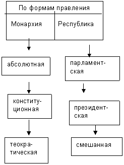 Под формой правления понимается способ организации верховной государственной власти, порядок образования ее органов и норм их взаимоотношений с населением. Традиционно различают две основные формы правления – монархию, при которой верховная власть сосредоточена в руках одного лица – монарха и, как правило, передается по наследству, и республику, при которой высшие органы власти избираются на определенный срок. В свою очередь, монархии делятся на неограниченные (абсолютные) и ограниченные (конституционные), а республики – на парламентарные (где правительство ответственно перед парламентом), президентские и смешанные. На практике такое деление во многом устарело, т. к., например, парламентарная республика сегодня имеет больше сходства с конституционной монархией (при которой монарх обладает лишь номинальной властью), чем с президентской республикой.