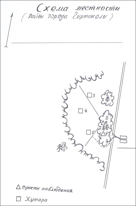 С пятью бойцами мы вышли во втором часу ночи из части, расположенной в городе Гиртаколи. Должны пройти вдоль шоссе и выйти к северной части рощи № 2 (смотри схему). К рассвету занять наблюдательный пункт в северо-западной части рощи, пункт № 6. Вести наблюдение в секторе: хутора № 3,4, указанный участок, и все, что там есть (результаты наблюдения) отразить на схеме. Возвращаться тем же маршрутом, вернуться надо не позднее 19 часов.