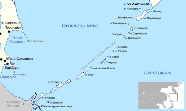 Полуостров Камчатка – наш, советский, там наши города и население, крупный портовый город Петропавловск, где мы остановились. Нас интересуют некоторые данные о Курильских островах, где расположены пограничные отряды. Читаем литературу: Курильские острова – архипелаг на границе Охотского моря с Тихим океаном, расположены между островом Хоккайдо (Япония) и полуостровом Камчатка. Включают более 20 значительных островов и множество мелких островков и скал, входящих в состав Сахалинской области СССР. Общая площадь – 13,6 тысяч квадратных километров. Состоят из двух параллельных гряд островов, представляющих собой вершины мощных подводных хребтов: Большой Курильской гряды, вытянутой на 1200 километров, и Малой Курильской гряды, которая окаймляет только южные оконечности Курильских островов (120 км), отделяясь от них Южно–Курильским проливом. Курильские острова разделены глубокими проливами, в том числе Крузенштерна и Буссоль, которые делят Большую гряду на три группы островов: северную (острова Шумшу, Атласова, Парамушир, Маканруши, Онекотан и др.), среднюю (Расшуа, Матуа, Кетой, Симушир) и южную (Уруп, Итуруп, Кунашир и Шикотан). На выделенных шрифтом и подчеркнутых островах