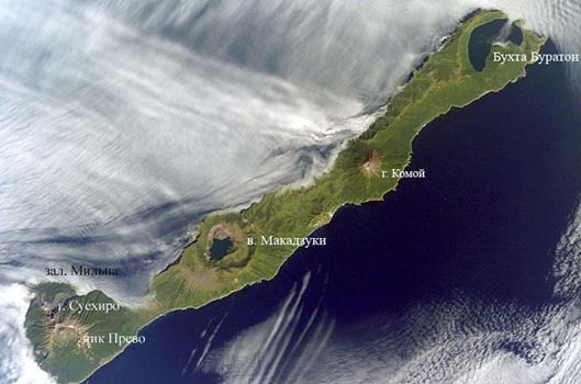 Знакомимся пока с островом. В материалах, имеющихся в штабе отряда, написано, что остров Симушир находится в средней части Большой гряды Курильских островов. Площадь – 320 км2, высота – до 1539 метров.
