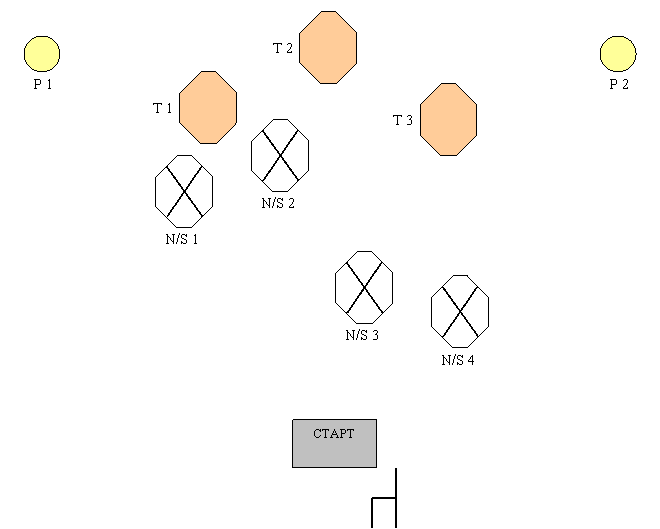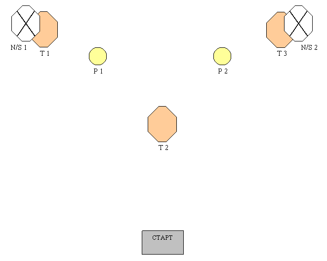 Тип: Короткое Тип счета: Комсток (10 патронов в магазине) Дальности: от 5 до 12 метров Начало упражнения: Звуковой сигнал Окончание: Последний выстрел | Мишени: 3-и классических картонных мишени IPSC (Т 1 - Т3), расположены на расстоянии от 5 до 12 метров, 2-е металли ческие тарелки (Р1 –Р2), 2-е не поражаемых мишени (N/S1 – N/S2) (заложники). Минимальное количество выстрелов: 8 Возможное количество очков: 40 Штрафы: по правилам IPSC |