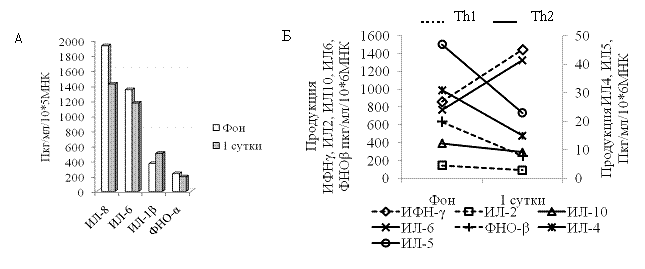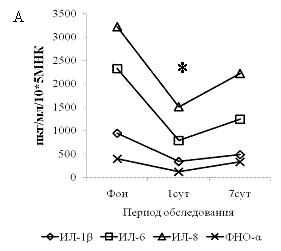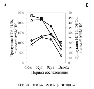 Изучение продукции цитокинов моноцитами периферической крови выявило значительную гетерогенность индивидуальных значений содержания ИЛ-8, ИЛ-6, ИЛ-1β, ФНО-α, связанную, вероятно, с различием функциональных резервов организма испытателей (рис. 4А).