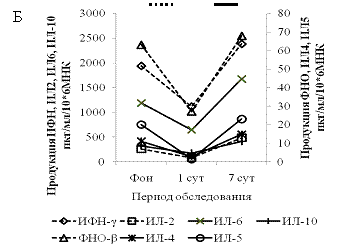 При анализе общей направленности изменений продукции цитокинов лимфоцитами периферической крови относительно фоновых значений, установлено, что на 7-е сутки иммерсии преобладало повышение стимулированной ФГА продукции цитокинов лимфоцитами (рис. 4Б). Выявленное повышение исследованных параметров, по-видимому, демонстрирует классическую реакцию активации, напряжения цитокиновой системы, мобилизации функциональных резервов в ответ на действие стрессирующего фактора.