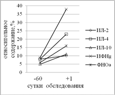 1) Содержание цитокинов в сыворотке крови (ИЛ-1α, ИЛ-1β, ИЛ-2, ИЛ-4, ИЛ-6, ИЛ-8, ИЛ-10, ИФН-γ, ФНО-α);