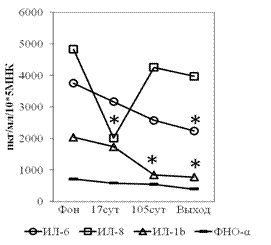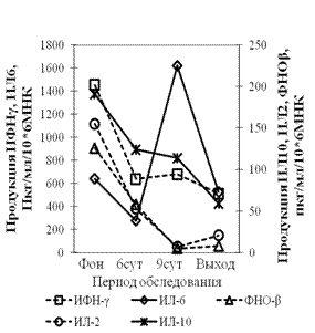 5. В условиях длительной 105-суточной изоляции в гермообъекте с искусственной средой обитания на 17-е, 105-е сутки у испытателей-добровольцев выявлено снижение продукции цитокинов моноцитарно-макрофагальным звеном, а на 105-е сутки изоляции - снижение продукции цитокинов лимфоцитами.
