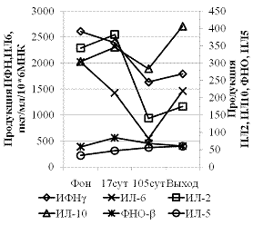 Уровень продукции цитокинов клетками периферической крови в эксперименте со 105-суточной изоляцией в гермообъекте с искусственной средой обитания.