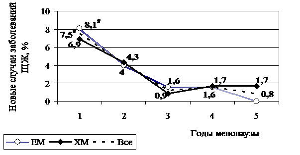 1. Общая заболеваемость тиреоидной патологией у женщин после естественной и хирургической менопаузы в йододефицитном регионе максимальна в первый год менопаузы и снижается с увеличением ее длительности.