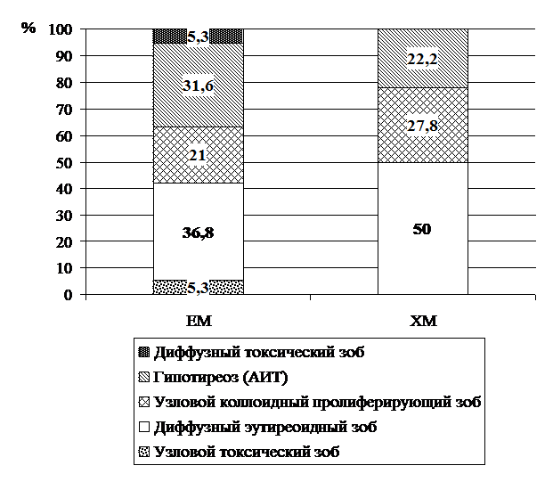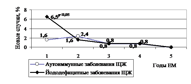 1. В регионе с дефицитом йода функциональные и/или морфологические изменения щитовидной железы встречаются почти у каждой второй женщины в возрасте 45 – 55 лет. Чаще всего регистрируются узловой коллоидный пролиферирующий зоб (17,4 %) и гипотиреоз вследствие аутоиммунного тиреоидита (14,5 %). Заболевания щитовидной железы, связанные с дефицитом йода (диффузный эндемический зоб, узловой коллоидный пролиферирующий зоб, узловой токсический зоб), выявляются в 1,4 раза чаще, чем аутоиммунные тиреопатии (ДТЗ и гипотиреоз вследствие АИТ) (р = 0,03).