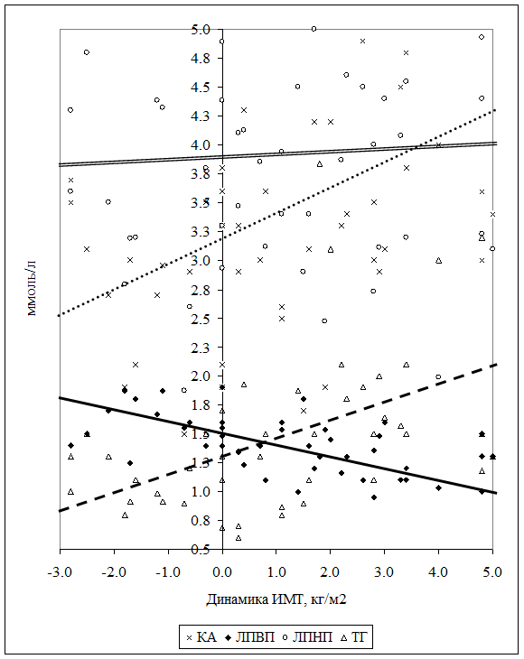 Рисунок 10. Корреляции между динамикой ИМТ и показателями липидного спектра у женщин после хирургической менопаузы
