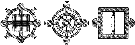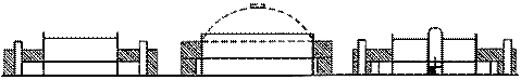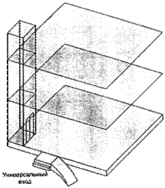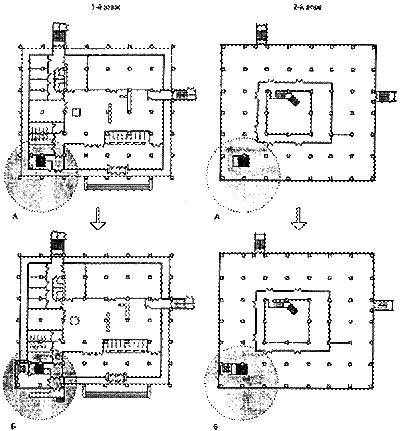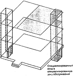 Методом строительства отдельно стоящих входных и лифтовых узлов с круговой обходной галереей при сохранении фронта естественного освещения Реконструируемого здания | Случаи, когда естественным прямым освещением можно пренебречь, - при создании пристроенной периметральной галереи с организацией входов в здание | ||
